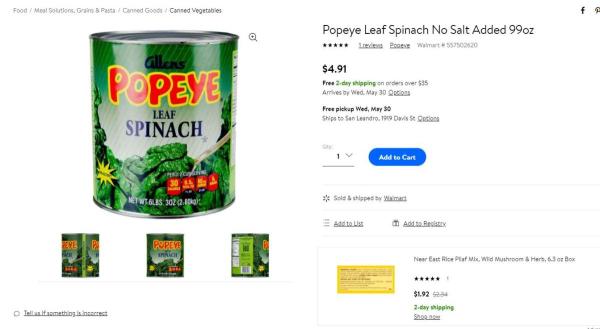 據說當時不少小朋友對菠菜的「變大力功效」信以為真,導致菠菜銷量一路看漲,而直到今天,在沃爾瑪的官網上還能找到寫有「Popeye」的蔬菜罐頭。