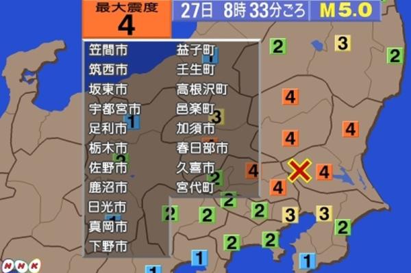【橙訊】據日本NHK新聞網報道,當地時間27日上午8點33分左右,日本茨城縣、栃木縣、群馬縣以及琦玉縣均發生了日本震度為4級的地震。位於震央的茨城縣南部錄得5級地震,震源深度50千米,就連東京也能感受到搖晃,目前地震並未引發海嘯。