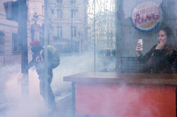 【橙訊】法國民眾上街抗議政府調升燃油稅,發起「黃背心運動」(Yellow vest movement),示威後來演變成激烈的反政府行動,引發法國半世紀以來最嚴重騷亂。在「重災區」巴黎,一張照片在網上瘋傳,相中一位女子在街邊的連鎖快餐店內舉著手機,面露笑容疑似在自拍。有網民就指,「兩個世界,只隔了一道玻璃。」