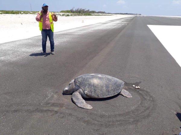 【橙訊】馬爾代夫島嶼馬法魯(Maafaru)國際機場日前發現了一名「稀客」,一隻雌性綠海龜在跑道上產卵,原來該處原屬海灘,去年才建成為跑道。該隻綠海龜事隔數年重返出生的沙灘上產卵,但卻發現「老家」變了樣。