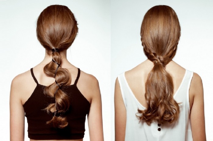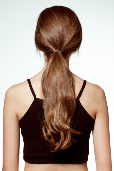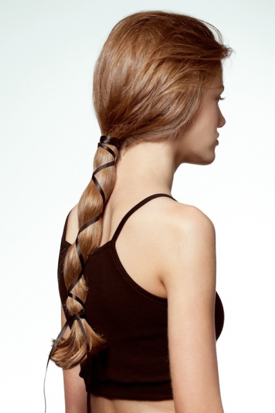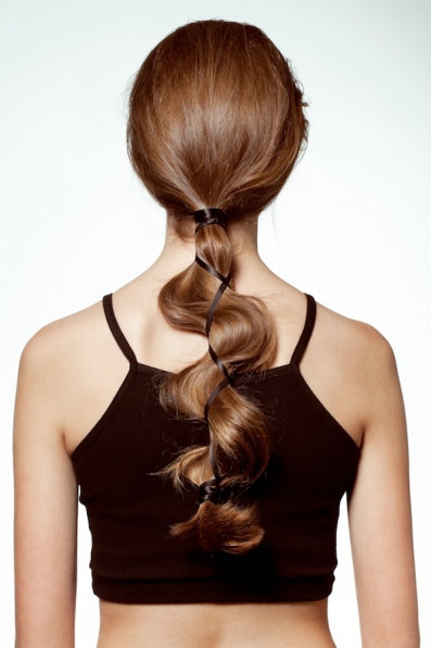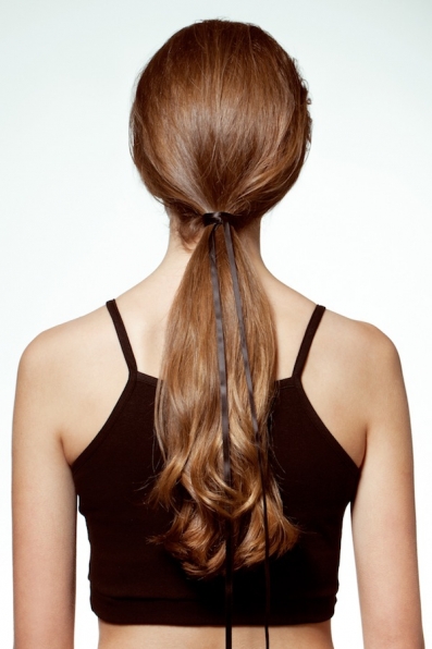 3.將細緞帶兩端來回交叉環繞馬尾(記得緞帶要拉緊),最後打結固定在馬尾尾端。