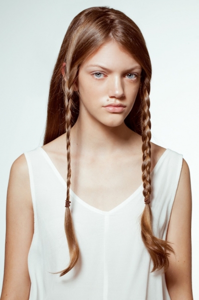 1.留下後面一大部分的頭髮後,再分出左右各一撮的頭髮。將左右兩撮頭髮各編織成三股辮。