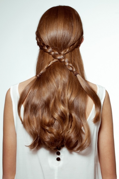 4.輕輕的用手把頭髮從交叉緞帶中一節一節拉出,營造出豐盈感。