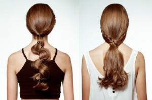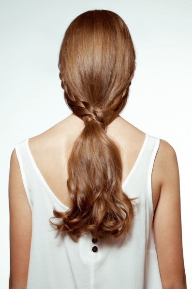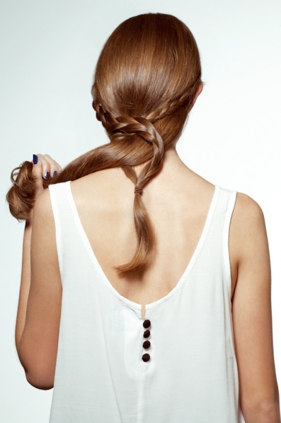 3.接著將兩份三股辮繞到下方綁起,讓原本後面那部份的頭髮形成一束馬尾。