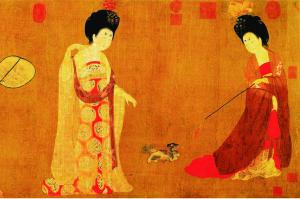 在中國,寵物狗是甚麼時候出現的呢?至遲在唐代,小型觀賞犬已經成了貴婦圈的寵物,描繪唐朝貴婦生活的周昉《簪花仕女圖》(遼寧省博物館藏)便畫了兩隻小巧玲瓏的寵物犬。這種小型觀賞犬叫作「拂菻狗」,唐初從西域高昌傳入,原產於「拂菻」(東羅馬帝國),「高六寸,長尺餘,性甚慧,能曳馬銜燭,云本出拂菻國。中國有拂菻狗,自此始也」 。又稱「猧兒」,極其名貴,只有宮廷貴婦才養得起。