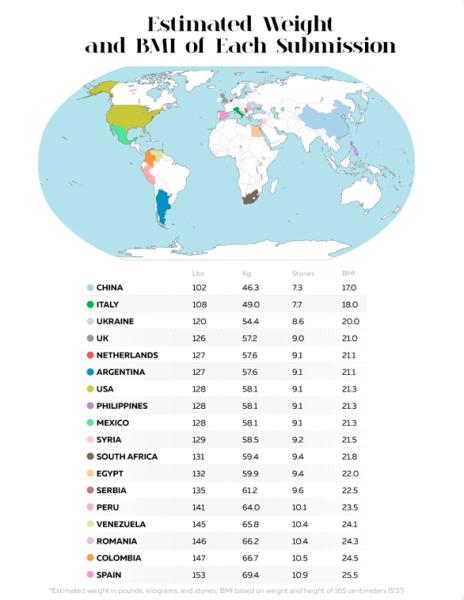 中國的BMI是最低的,只有17,因為照片中的女人看上去不到50KG。西班牙最高,有25.5,照片裡是個70KG左右的胖女孩。