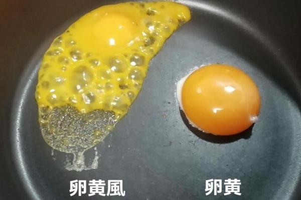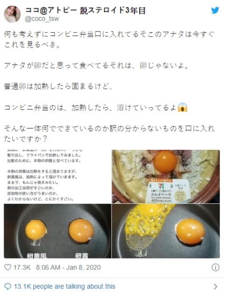 日前揭發便利店使用「假雞蛋」的是Twitter用戶coco_tsw,她上載的圖片可見有一盒通粉,把通粉裏頭的蛋黃和真正的蛋黃放在鑊上加熱,比較加熱後的情況,發現來自通粉的雞蛋不像正常雞蛋般,加熱後會變硬,反而是融成一團,並且冒出氣泡。網民紛紛留言表示難以置信,有人直言說似「冒氣泡的鼻涕」。