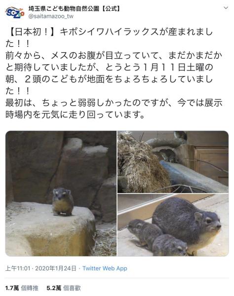 日本埼玉縣的兒童動物自然公園(こども動物自然公園)日前在Twitter上發佈了一系列照片,恭賀這對1月11日剛誕生的蹄兔寶寶。照片到目前已經獲得超過5萬讚好,萌倒了不少網民。