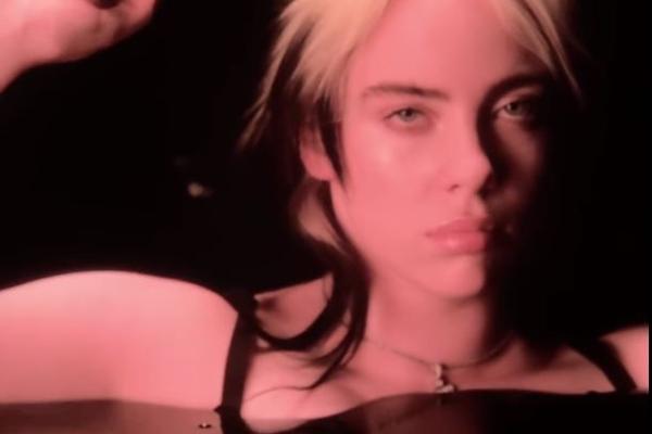 Billie Eilish在歌曲間場短片中除衫露胸圍。(網圖)