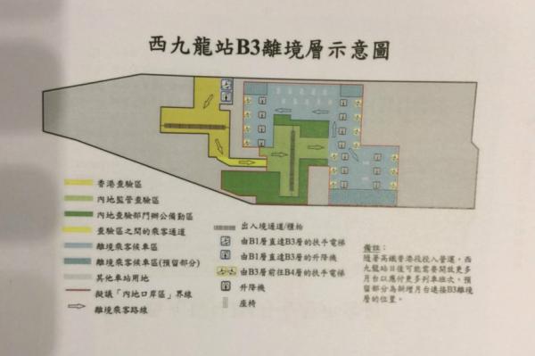 【橙訊】政府公布一地兩檢方案,高鐵西九龍總站樓高5層,地面為大堂,北上乘客在總站B1層的售票大堂購票後,將直接前往B3層的「香港口岸區」辦理香港出境程序。