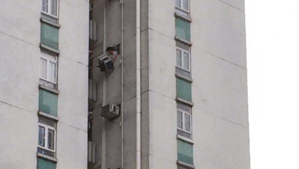 但戶主及時發現,半身伸出冷氣機窗口,徒手凌空捧着冷氣機,等待管理處施援,險象環生。