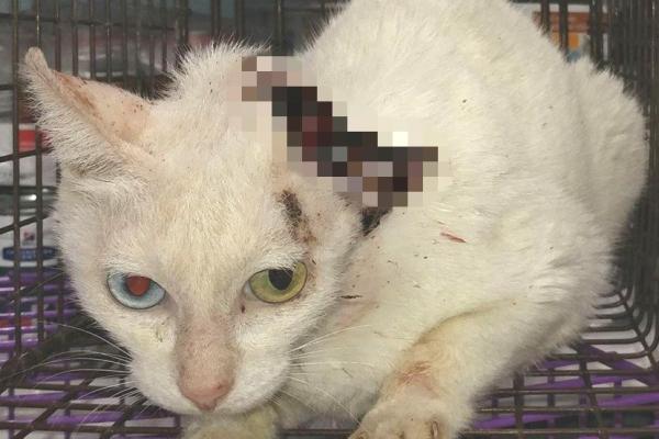 【橙訊】元朗發生懷疑虐貓事件,一隻白貓前日晚上被市民發現被困在錦上路一個籠內,左耳傷勢嚴重潰爛,且鮮血不停流出,傷口亦沒有止血,愛貓人士見狀大驚報警,並送進診所治療。及後,警方拘捕涉案男主人,涉嫌虐待動物,愛護動物協會目前已經保管該貓隻。