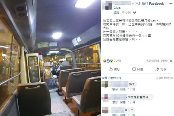 該網民凌晨在社交網站facebook群組「巴打絲打Facebook Club」發文,指搭乘一輛由灣仔前往荃灣的通宵紅色小巴,全車只有他一個乘客,惟上車不足5分鐘,司機突然大叫「差一個齊人開車」,惟在車上等了10分鐘,亦沒有任何人上車,於是向網民求救「我應唔應該落車搭下架」。