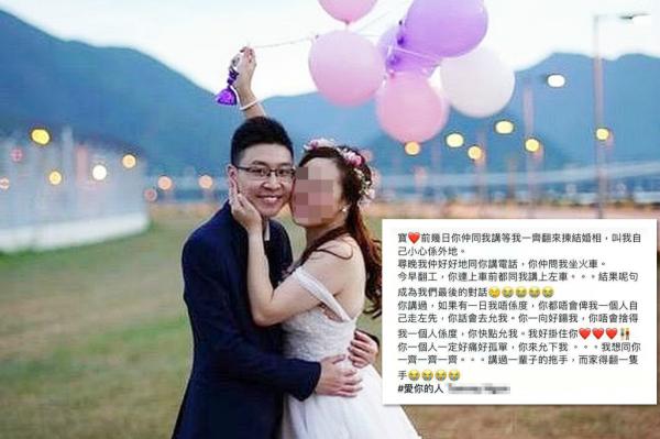 【橙訊】青衣長青公路奪命車禍中,有兩名死者為國泰員工,其中最年輕的30歲死者顏浩斌原定於下月舉行婚禮,與同為地勤的未婚妻拉埋天窗,如今天人永隔。事發時,未婚妻Kit正在歐遊,她得悉時間後傷心欲絕,並在Facebook發文悼念。