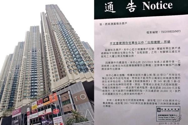 【橙訊】將軍澳私人屋苑將軍澳廣場疑有單位,透過網絡平台將住宅單位作為「出租旅館」之用,涉違屋苑大廈公契及相關法例。屋苑管理處表示已將事件向民政事務總署舉報。