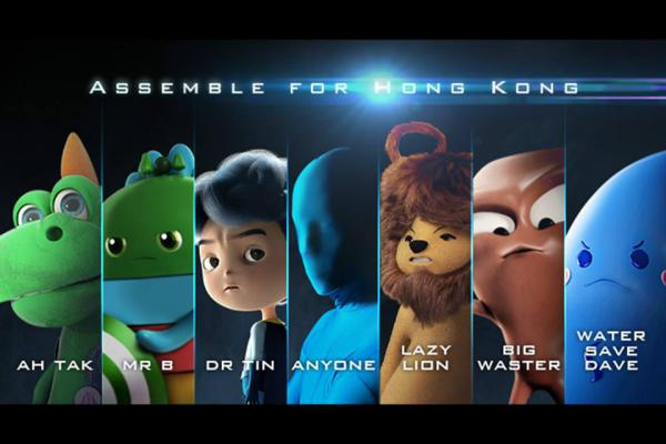 環境局的吉祥物「大嘥鬼」就發動號召,「超級英雄終極集結,守護地球,守護香港!單單講同口號,係唔夠㗎,起身啦....大家都有責任㗎!用少一支飲管、一個遮袋唔算係咩,但係.......集合咗大家嘅力量,我哋就可以發揮最大能力喇」。
