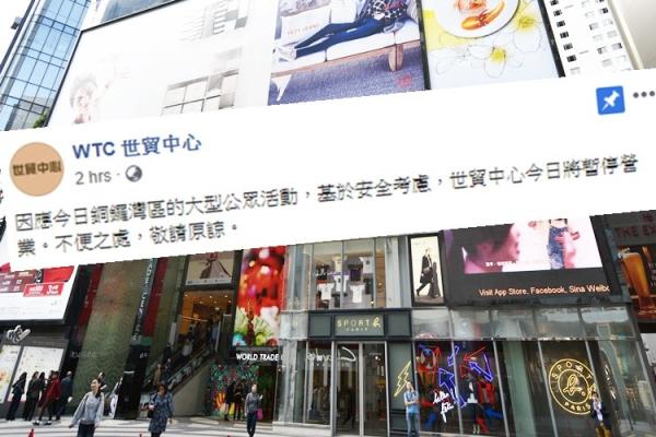 【橙訊】因應今日銅鑼灣區的大型公眾活動,基於安全考慮,位於告士打道280號的世界貿易中心(WTC)早上在社交網站facebook專頁宣布,今日將暫停營業。