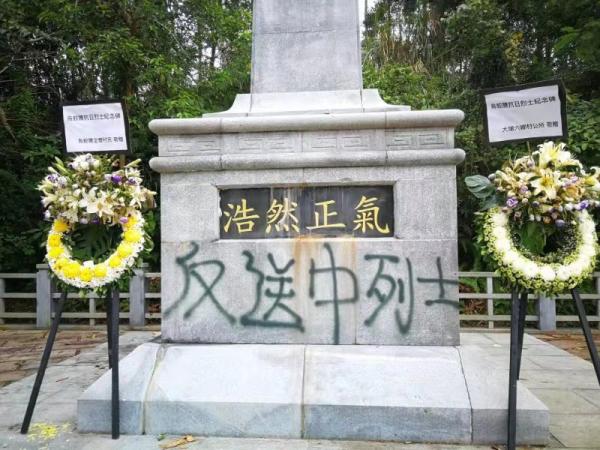 【橙訊】反修例示威衝突持續,多個月來香港不少地方遭示威者破壞和塗污。在明日「918」事件88周年前夕,全港唯一一個國家級抗戰遺址烏蛟騰抗日烈士紀念碑,亦被發現有多處地方被塗污,噴上「反送中」、「反送中列(烈)士」等字眼。