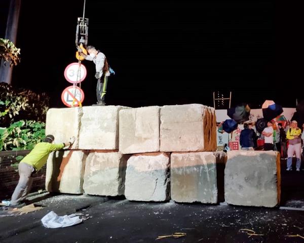 凌晨零時過後,運載多塊大型石躉的重型車駛至現,將石躉吊運上橋面後,疊起石躉封閉橋面。