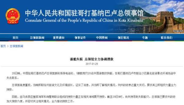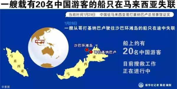 28日晚,中國駐哥打基納巴盧總領館接到領保電話稱,1艘載有約20名中國遊客的快艇,在哥打基納巴盧市前往沙巴著名旅遊景點環灘島途中失去聯繫。