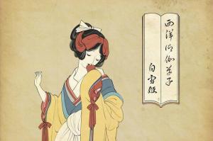 先來看看「白雪姬」白雪公主:在依然使用紅黃藍三主色的基礎上,插畫家將她的穿著改成精美的和服,而微微低頭品嘗蘋果的畫面,讓白雪公主顯得更加楚楚可憐。