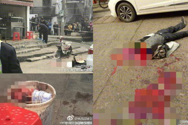 武漢市公安局指,昨日下午12時半左右,在武昌火車站東廣場一間炸醬麵館,一名22歲四川姓胡男子,因發生口角糾紛,在麵店門口將42歲姓姚老闆斬死。現場血流一地,疑兇事後在案發現場蹲著。警察到場後封鎖現場,並拘捕疑兇。警方繼續調查事件。