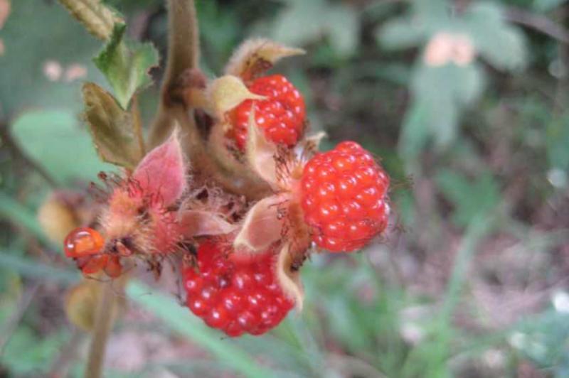 懸鉤子屬(Rubus)植物Rubus reflexus在香港常見。「懸鉤子」一名,強調其攀爬(懸)及莖有刺(鉤)外形特徵,名字沒透露另一重要特徵:其果是聚合果,由許多小漿果聚集而成,沒果皮,採摘時自花托以下將之脫下,醬果似中空的釋迦頭或倒覆的臉盆,英語「覆盆子」(Raspberry)或中國俗名「空心泡」由此而來。草莓也是薔薇科聚合果,但不中空,所以並非懸鉤子屬而是草莓屬(Fragaria)。懸鉤子屬在香港有八種,其中五種果可吃或供藥用,鏽毛莓是其一,但不是最美味吸引的品種。