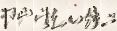 近期靳埭強忙著為呂壽琨逝世四十週年紀念展創作一組作品——長2.5米、高3.5米,5張紙拼在一起的大手筆。上面依稀可見「水墨為上」四字,說不清是以字入畫,還是以畫入字,遠看是行草,近觀有山水。「墨」字讓他甚為得意,「紙鋪在地下,腳踩在紙上,一次就寫出來了,是不是很厲害?哈哈。」