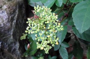 5月始,四周都可見角花烏蘞莓「嶄露頭角」,冒出花苞來;現在,其中幾朵小黃花開了,引來過客的注意。角花烏蘞莓屬草質藤本,葡萄科,常攀援於灌木或喬木枝幹上;小花苞密密地向外開展,交織成可愛的小花網。花別具特色,花瓣頂端有突出外展的小角,故名曰「角花烏蘞莓」。