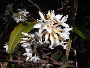 初見它時只有不起眼的花蕾,兩星期後再訪,喜見已開花。這是一株不高大的灌木,花聚生頂端,有濃香。