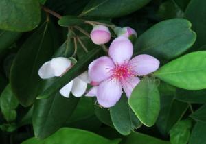 桃金娘狀花大而美。你能發現同一棵桃金娘開著色彩不同的花,絢麗多變;花初開為桃紅色,隔幾天轉為淡粉紅,然後風吹瓣落,青澀果子漸大,成熟時色彩變深,漸現醉人的暗紫色。
