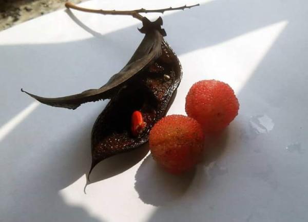 六月早上,走畢「東區自然步道」後,順道轉往「鰂魚涌樹木研習徑」。走到尾段,路上乍見亮麗的紅豆,彎身,拾起凹葉紅豆的果莢,內有乾癟了紅豆一顆……抬頭,厚雲間隱約傳來雷聲,夾雜「沙沙」雨響自遠而至;不一會,冰涼雨點構成的半透明帳幔終於乘風飄來。