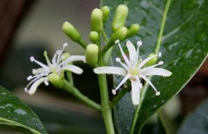 山油柑的花形細小卻易認漂亮,初夏時,在豐滿濃綠的樹葉間盛放;那狹長花瓣伴以向外伸展的雄蕊,如銳角的星星,或片片飄香的雪花。