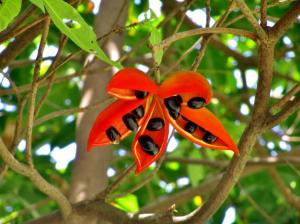 地上零星散佈著紅豔豔的假蘋婆樹的落果,仔細看,上面竟有數隻棉紅蝽開Party,正在快樂吸食果實的汁液。假如你在夏天七、八月曾頂著猛烈陽光行山,準會跟這種掛在枝頭的耀眼果實相遇過。