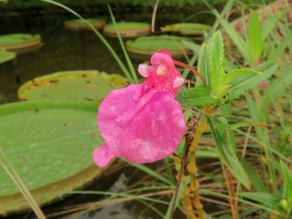亭子旁有一叢華鳳仙開花了,相對於淡紅色彩的荷花和形狀簡潔的水金英,艷紫紅色的華鳳仙確實顯得有點刺目了。