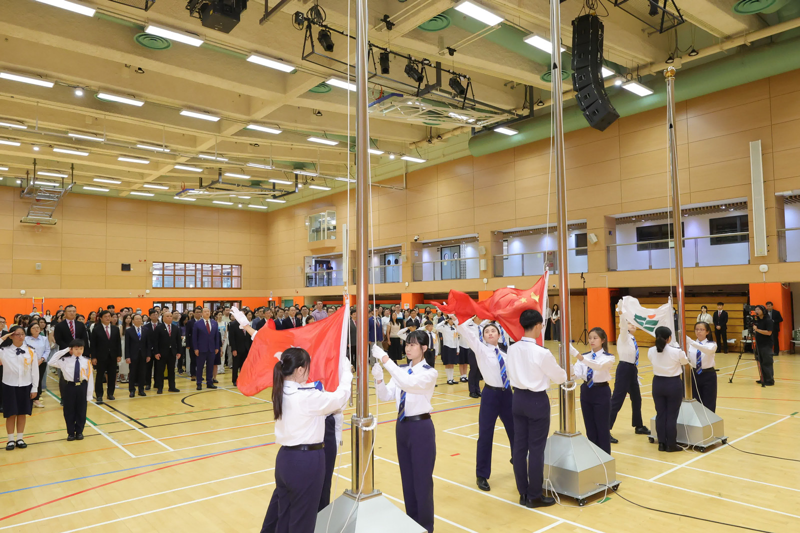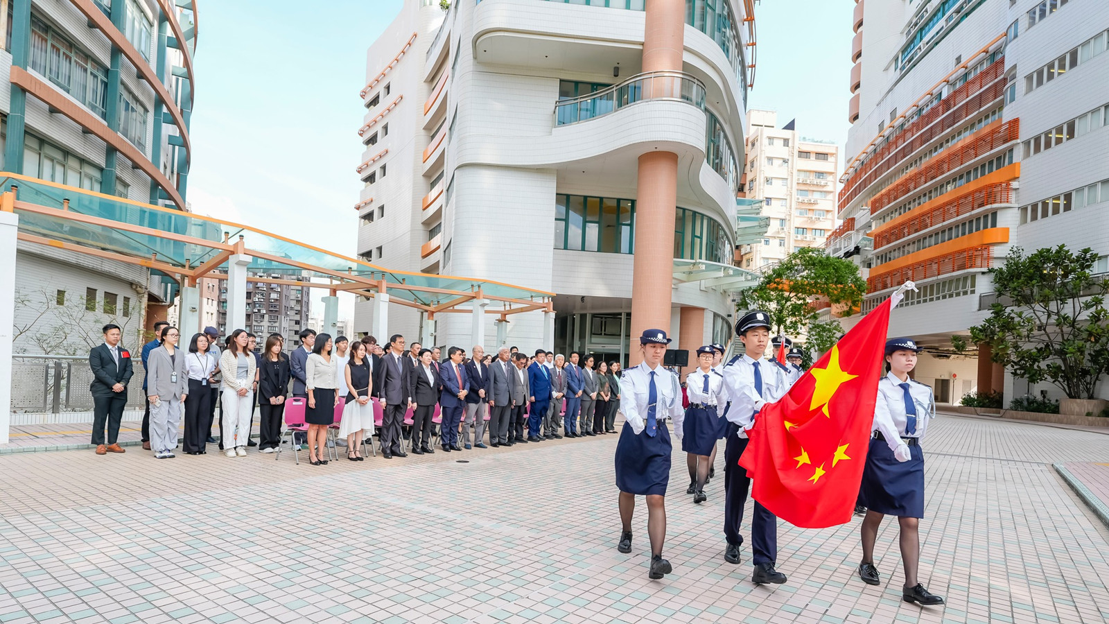 香港大學今早在百周年校園李兆基會議中心大會堂舉行升旗儀式,港大校務委員會主席王冬勝及校長張翔連同校務委員會和教務委員會成員,以及學院院長及教職員和學生及獲邀嘉賓等出席。