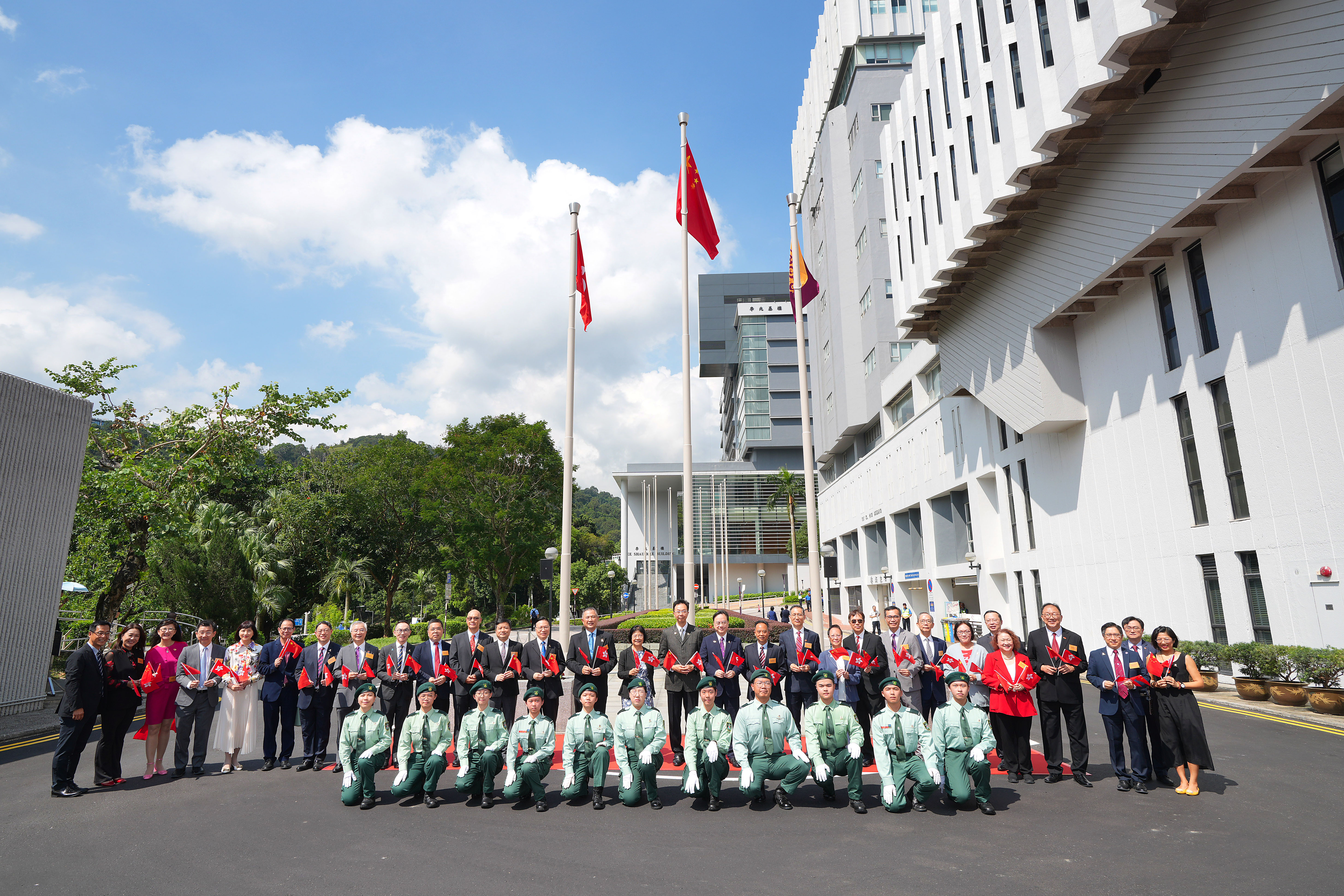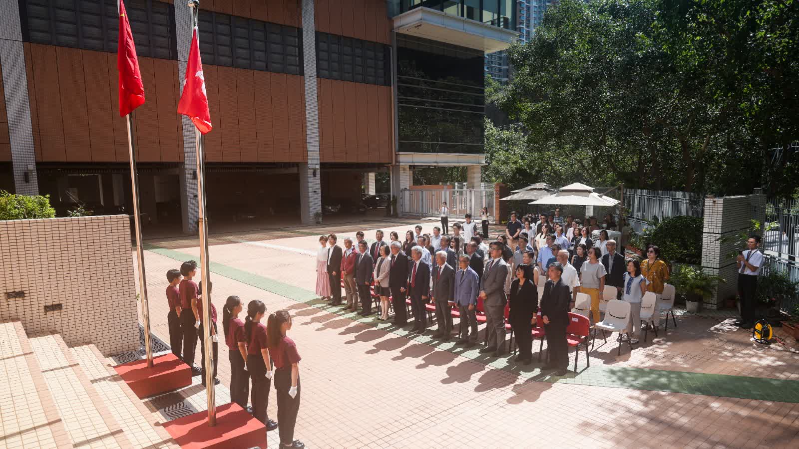 香港樹仁大學舉行國慶日升旗儀式,主禮嘉賓包括仁大校董會副主席張舜堯、校務委員會主席黃錫楠、校董會成員龍子明、潘琪偉、校務委員會委員鄔鎮華、署任校長胡懷中、首席副校長孫天倫及大學管理層成員,各學系及行政部門主管、教職員及學生亦有出席。