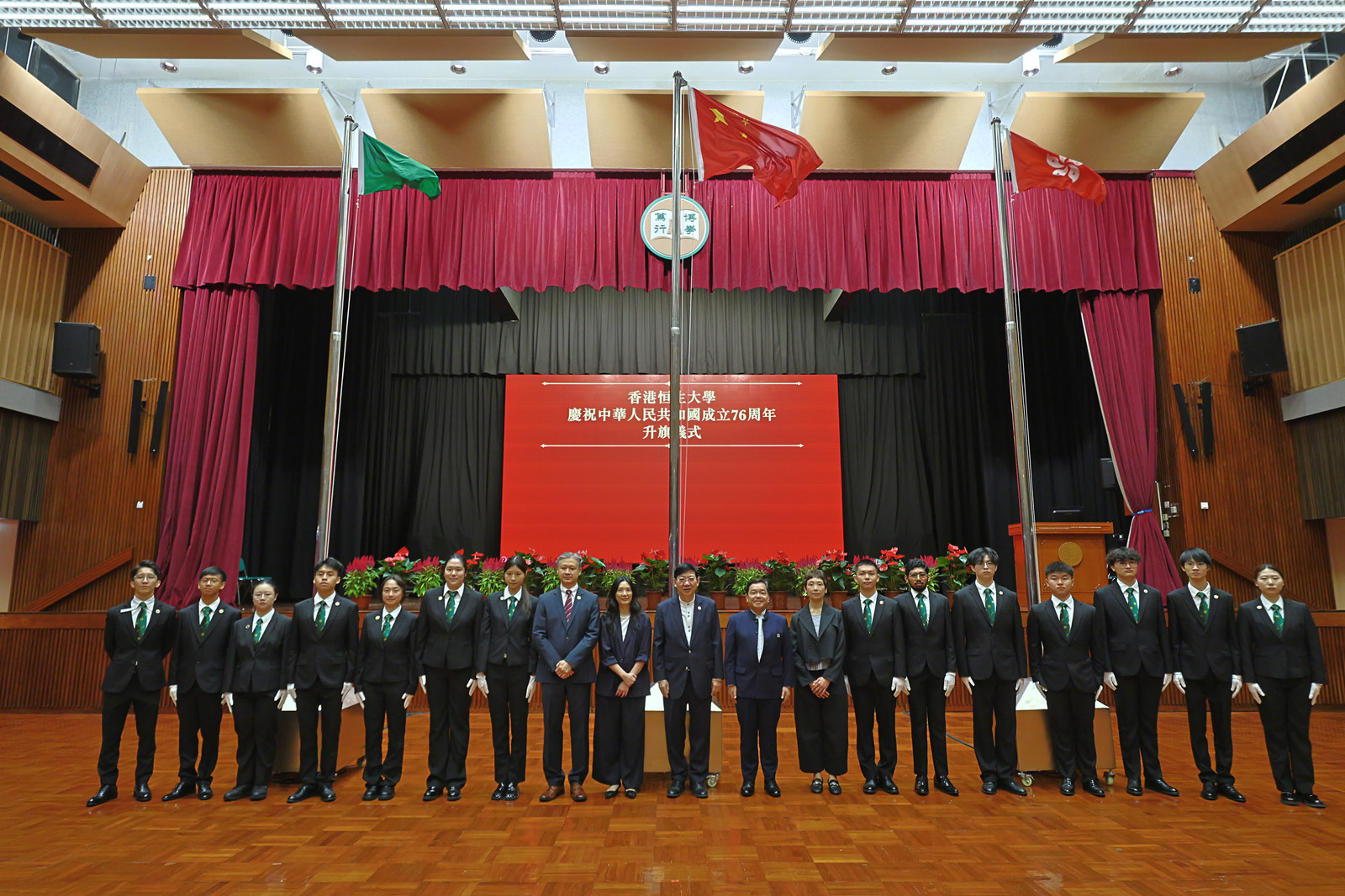 香港理工大學(理大)今早於校園舉行升旗儀式,慶祝中華人民共和國成立 76 周年。升旗儀式由理大校董會主席林大輝博士、校長滕錦光教授及中華人民共和國外交部駐香港特別行政區特派員公署政策研究室主任包海斌參贊主禮。校董會副主席葉中賢博士、大學顧問委員會主席顏吳餘英博士、大學司庫李健、大學顧問委員會榮譽主席鍾志平博士及榮休校長潘宗光教授大紫荊勳賢,聯同一眾理大校董會成員、大學顧問委員會成員、管理層、榮譽博士、大學院士、傑出校友、理大基金會成員,逾 1300 名嘉賓、師生和校友出席儀式,祝願國家富強昌盛,香港繁榮穩定。儀式由理大學生升旗隊負責。