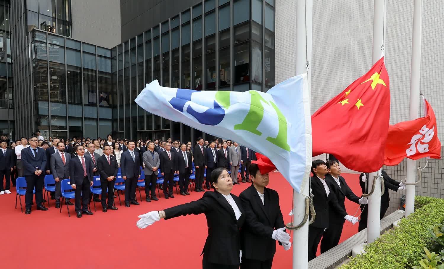 香港科技大學今早於校園內舉行升旗儀式,外交部駐香港特別行政區特派員公署條法部主任周倩參贊擔任主禮嘉賓,科大副監督陳祖澤、顧問委員會主席廖長城及校長葉玉如,聯同科大校董會成員、顧問委員會委員、大學管理層、教職員、學生、校友及其家屬逾400人參與慶祝典禮,另有逾萬人次在網上觀看直播。參與典禮的嘉賓和科大成員共同見證國旗、區旗及校旗於火鳥日晷雕塑前冉冉升起,祝願祖國國運昌隆,香港繁榮穩定。