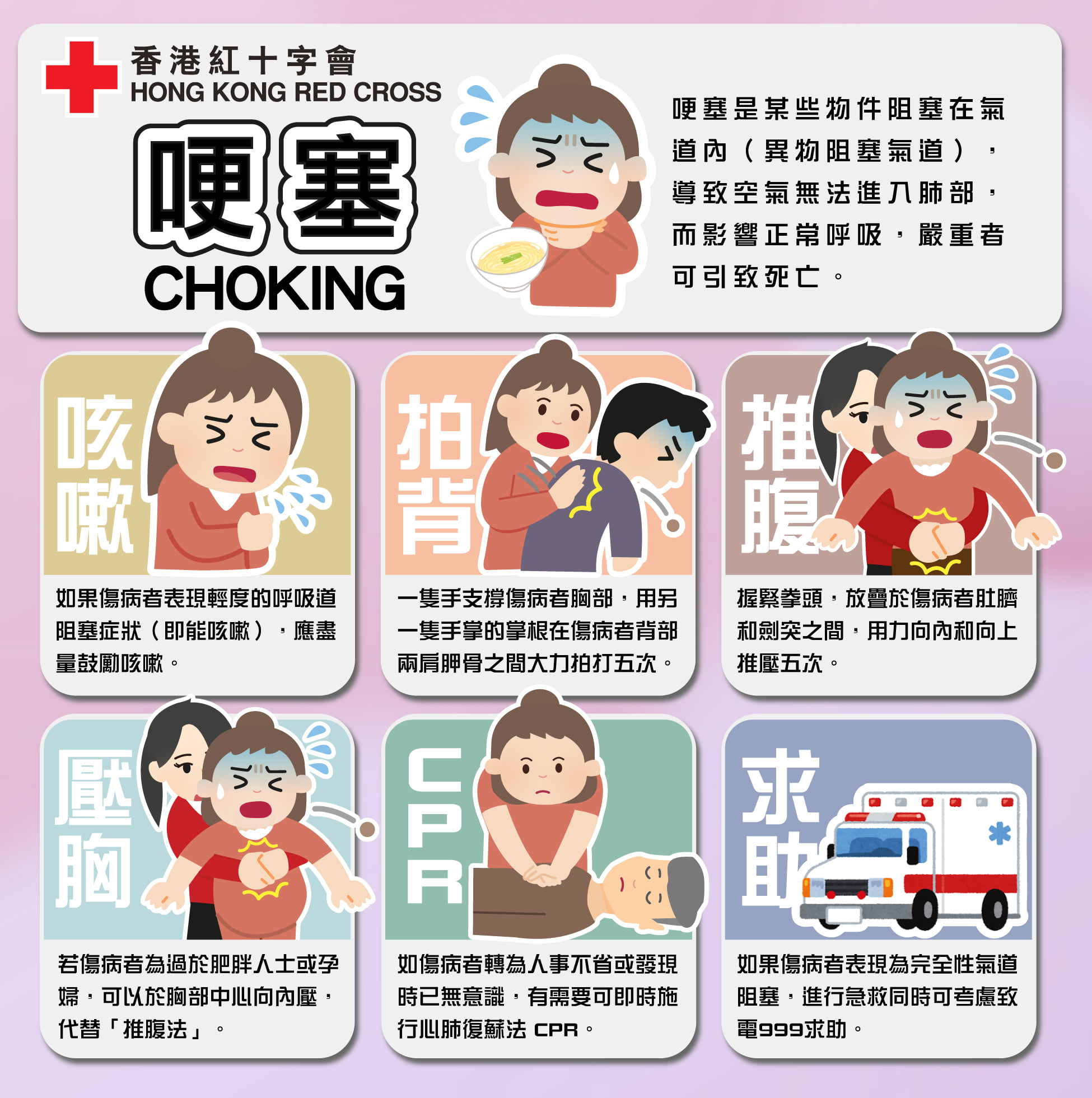 鯁喉即「哽親/哽塞」,指食物或其他異物阻塞了氣管或咽喉的危急情況,若不及時救治均可致命。消防處曾透過其網頁教導市民遇上鯁喉時的應對方法:如患者神志清醒,並能夠用力咳嗽,保持冷靜,鼓勵患者繼續咳嗽,陪着患者,密切監察其情況;如患者氣道完全受阻,無法咳嗽,則要保持冷靜,施行「謙烈治法」( Heimlich Maneuver),致電「999」召喚救護車。